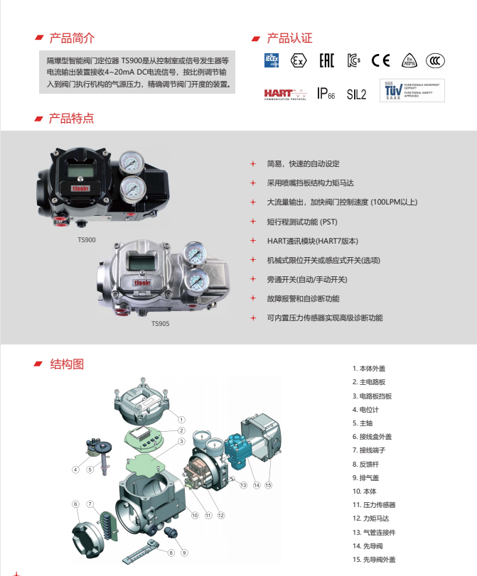 智能阀门定位器TS900是从控制室或信号发生器等电流输出装置,接受4~20mA DC电流信号,按比例调节输入到阀门执行机构的气源压力,调节阀门开度的调节装置。
